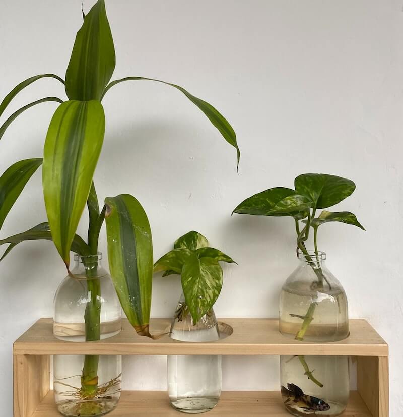 - 수경재배 팁: 건강한 줄기를 1~2마디 잘라 공중뿌리가 있는 마디를 물에 담가줍니다. 물은 4~6일마다 교체하고 밝은 간접광에서 관리 하세요. 병 입구가 넓고 안정감 있는 유리병이 좋아요. (잎이 커서 쓰러지기 쉬움)